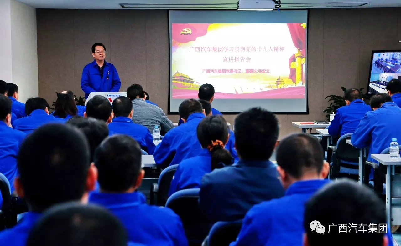 為深入學習貫徹黨的十九大精神,?12月6日,廣西汽車集團舉行學習貫徹黨的十九大精神宣講報告會,廣西汽車集團黨委書記、董事長韋宏文在會上作題為《新時代·新氣象·新作為》宣講報告。集團公司黨委領導、各級黨組織書記、一級經理、所屬企業(yè)負責人等一百多人現場聆聽了報告,山東、重慶、桂客等單位以視頻形式參加報告會。