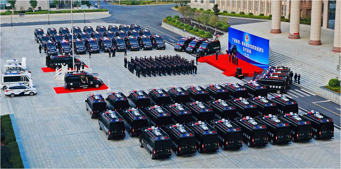 這批反恐武裝巡邏車是公司根據(jù)廣西全區(qū)反恐實戰(zhàn)需求和區(qū)域特點,研發(fā)生產(chǎn)的全新一代五菱V80特種專用警務(wù)產(chǎn)品。每輛應(yīng)急反恐武裝巡邏車能滿足5-6個警員攜帶裝備執(zhí)行出警和應(yīng)急處突任務(wù),整車安裝有防護(hù)網(wǎng),前撞擊桿,后防護(hù)桿,可清除一般性障礙,撞擊作案車輛,具有強悍的防暴制暴和突擊能力及穩(wěn)固的自我防護(hù)能力等特點。同時,該車還配備有全方位星光級夜視車載智能監(jiān)控系統(tǒng)、升降式強光照明燈、公安網(wǎng)移動上網(wǎng)本及多形態(tài)電源供給系統(tǒng),可與各級公安監(jiān)控指揮中心實時聯(lián)絡(luò),即使在極端惡劣條件下,均可啟動全方位監(jiān)控及語音通訊功能,通過