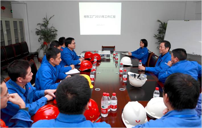 ? ??隨后,韋董一行來到公司柳東工廠進(jìn)行調(diào)研,在參觀生產(chǎn)現(xiàn)場后與柳東管理團(tuán)隊進(jìn)行座談。柳東工廠廠長黃輯匯報了2015年柳東工廠運(yùn)行情況及2016年業(yè)務(wù)突破。